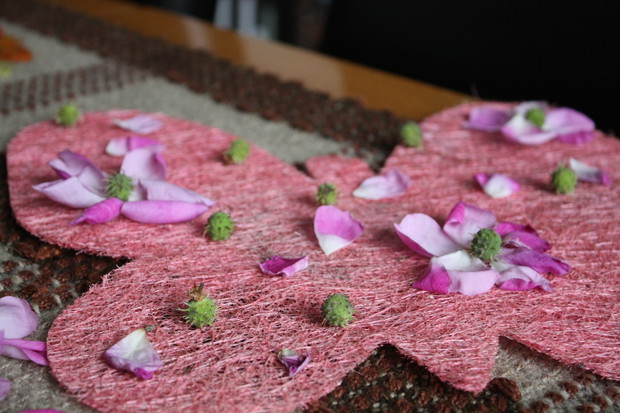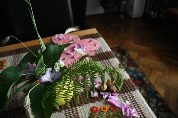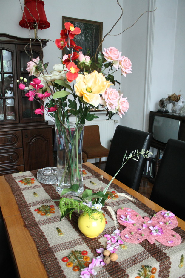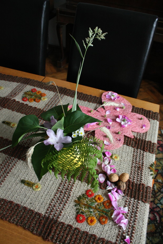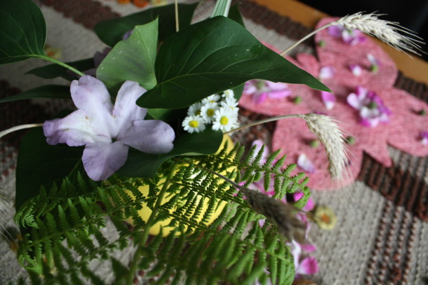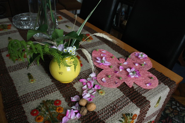 Moim hobby oprócz pielęgnacji ogrodu jest robienie dekoracji. Dlatego w moim domu i ogrodzie mam figurki, które ustawiam tak, by tworzyły miły nastrój. Tych dekoracji jest u mnie dużo.... Ale staram się również tworzyć bukiety i inne dekoracje z kwiatów. Ostatnio ucięłam kilka różyczek z mojego ogrodu (szkoda, że zakwitły po tym, jak zrobiłam galerię o różach) i ozdobiłam nimi mój stół. Drugi bukiet wykonałam z liści bzu, trawy ozdobnej, paproci oraz kwiatów rododendrona i stokrotek :). Wiem, że nie mam się za bardzo czym chwalić :) , ale ten bukiet nie jest aż taki zły :). Chciałam jeszcze przyozdobić plecionego motyla. Pomogły mi w tym młode kasztanki, które spadły z mojego kasztanowca (polecam moją galerię o tym 80 - letnim drzewie) oraz płatki róży pachnącej. Dziękuję za obejrzenie tej galerii i pozdrawiam, rolnik :)