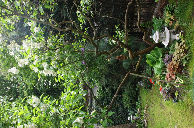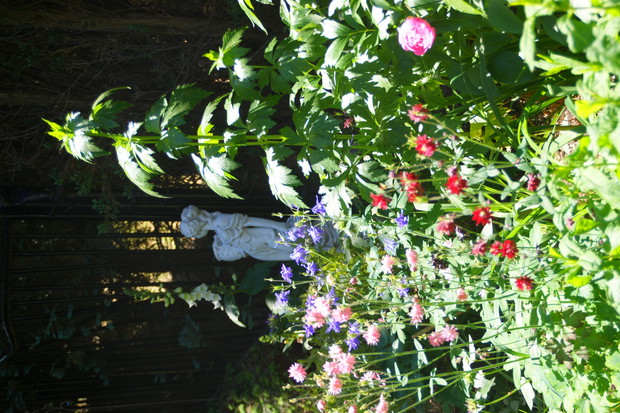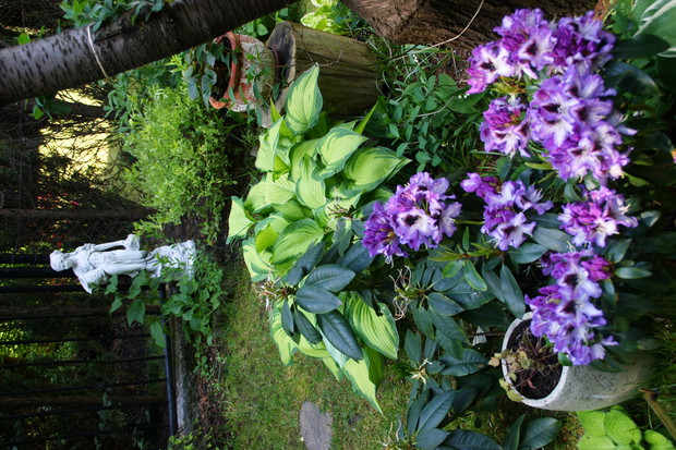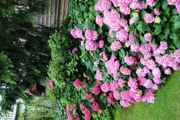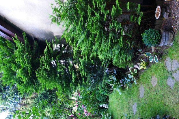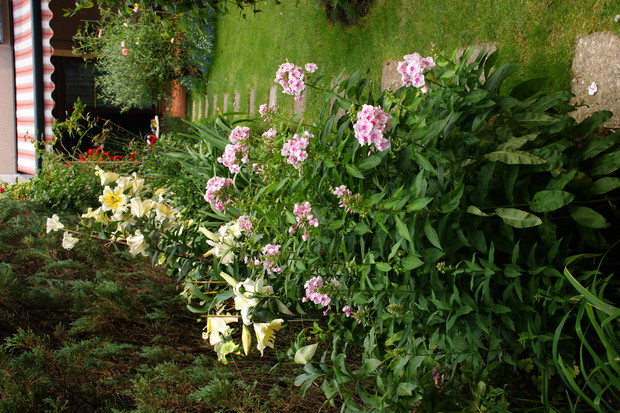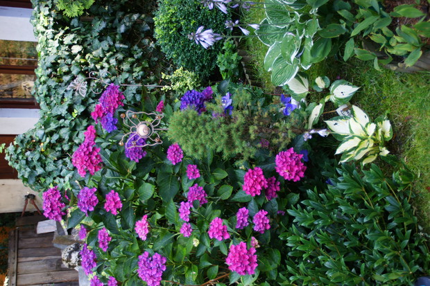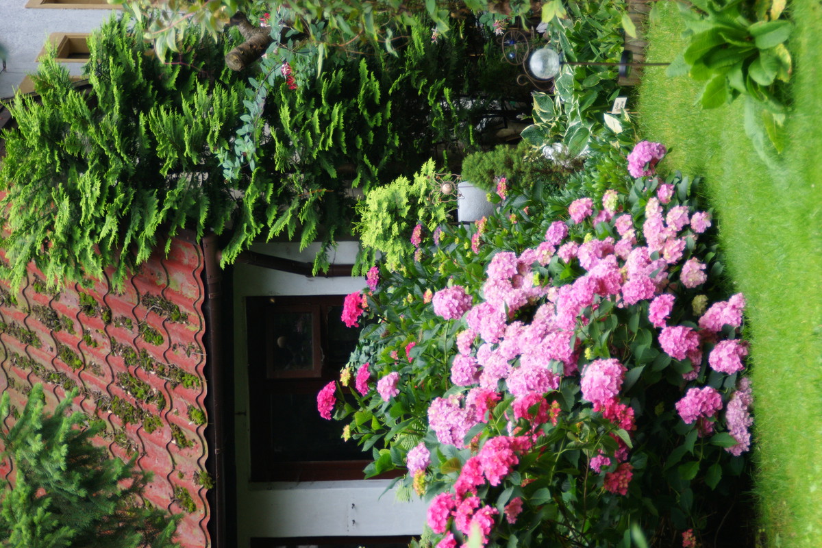 Ogródek który przedstawiam jest niewielki ale pomimo to staram się aby był ciekawy , pełen kwiatów i zapachów . Latem dominują hortensje których ilość kwiatów każdego roku mnie zadziwia. Co do zapachów to lilie drzewiaste nie maja sobie równych , zaś uroku w zacienionej części ogrodu dodają funkie i żurawki. Lubię kiedy ogródek ma ciekawe zakątki stad jest ich kilka w moim ogródku myślę że są one miłym dopełnieniem całości .Ogród jest podzielony w naturalny sposób na dwie części . Pierwsza przy tarasie w pełnym południowym słońcu zaś druga mocno zacieniona. To oczywiście narzuca dobór roślin. Stąd w pierwszej części dominują róże i piwonie no i oczywiście lilie drzewiaste a w drugiej moje ulubione funkie i żurawki. Akcent kwiatowy tworzy hortensja. Niektóre odmiany moich funkii pięknie pachną co jest ich dodatkowym atutem.
