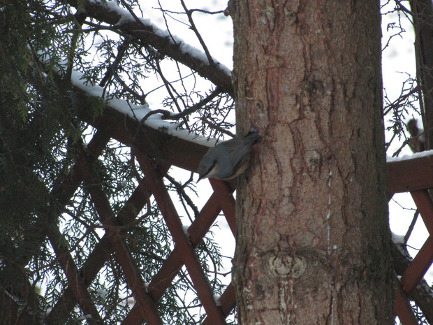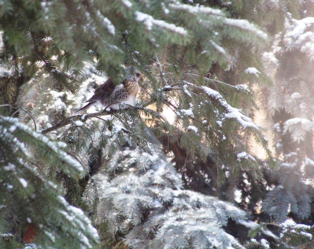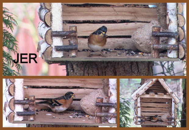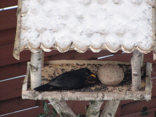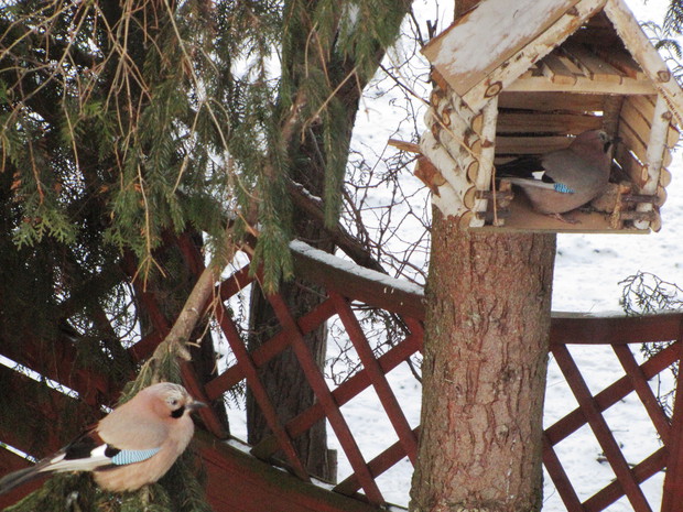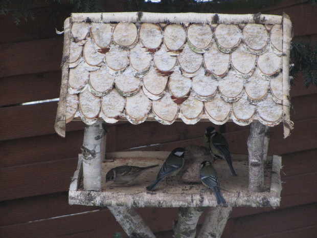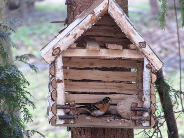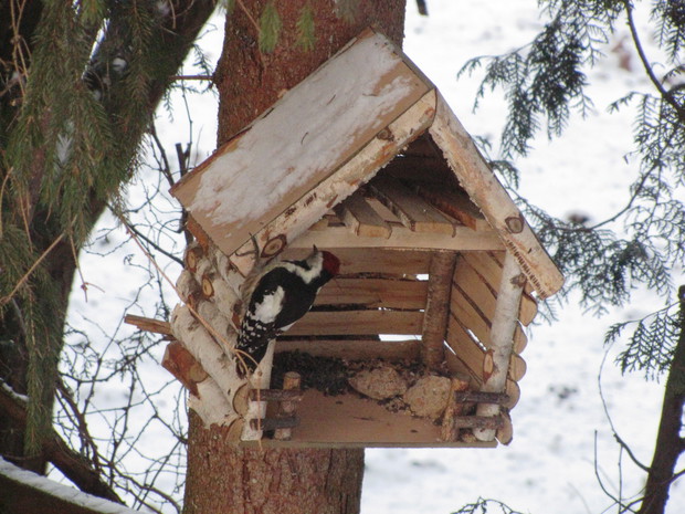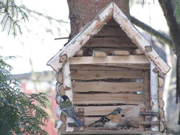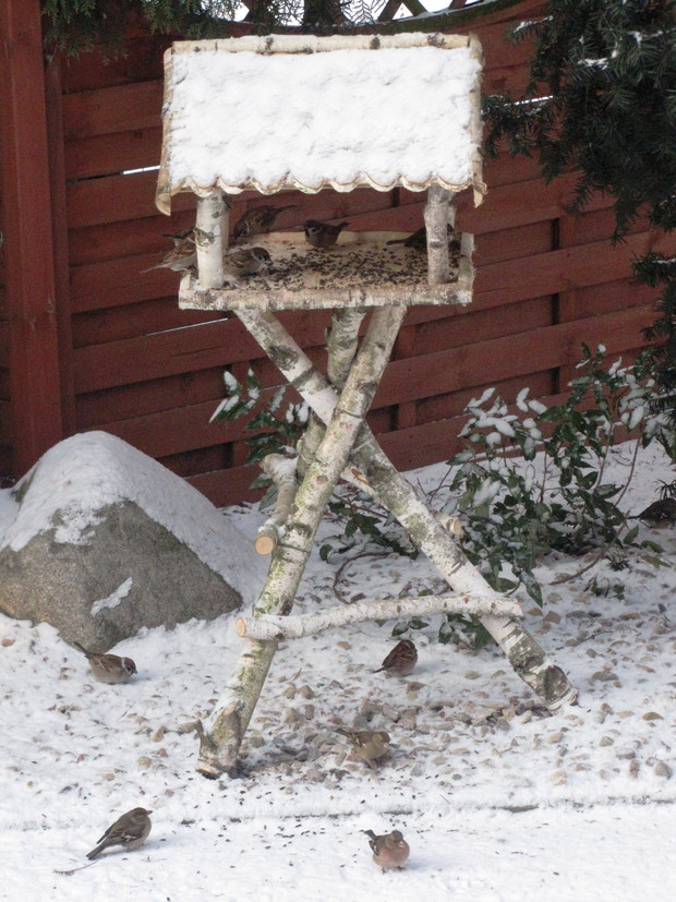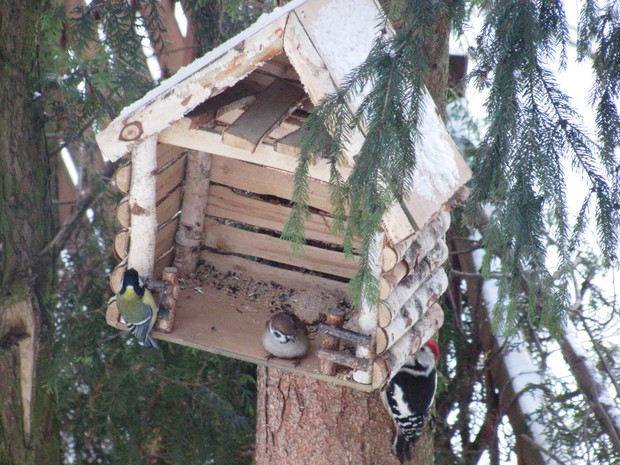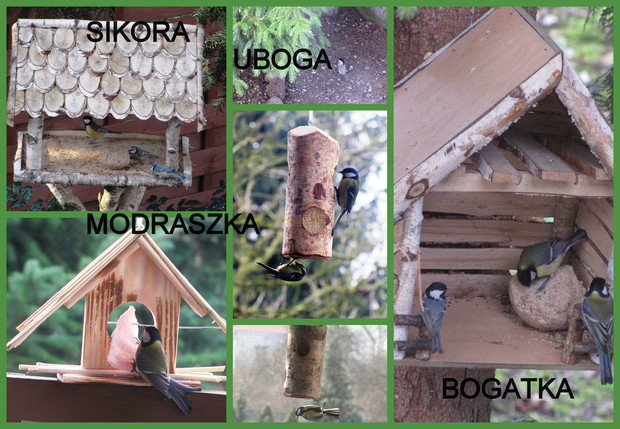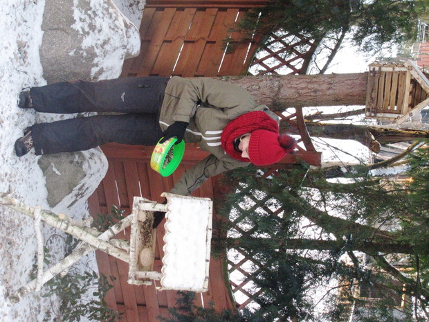 Tłoczno przy karmnikach. Jesienno- zimowy okres to w moim domu czas dokarmiania i obserwacji ptaków. To zimowa pasja. Nowy Rok 2016 przywitał nas opadami śniegu, a noc później sporym mrozem ( -15 C). Śnieg i tęgi mróz sprawił, że od wczesnego ranka, przez cały dzień przy karmnikach tłoczno było od ptaków. Modraszki, bogatki i sikorki ubogie, wróble, rudziki, kowaliki, jery, a nawet dzięcioł okupowały karmniki z ziarnami słonecznika, orzechami i makiem. Inne tłoczyły się przy dziuplach ze smakołykami i słoninkach. Na ziemi uwijały się czerwone i żółte zięby, dzwońce, sierpówki i mazurki. Bystre kawki, sójki i sroki brały co chciały, przeganiając resztę drobniejszego ptactwa. Kosy i kwiczoły trzymały się z dala tłoku, zadowalały się głównie owocami. Po raz pierwszy też dzisiaj w karmniku zagościł grubodziób. Z poidełka z wodą korzystały wszystkie, a i pozostawionymi na zimę łodyg bylin z nasionami. 2 kg słonecznika i 4 rozkruszone tłuszczowe kule, taka ilość dzisiaj okazała się za mała, cóż gromadka 19 gatunków potrafi wiele.