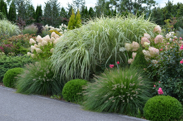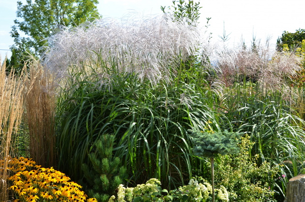 Miskant chiński 'Variegatus' - ozdobna, silnie rosnąca trawa, tworząca duże, gęste i przewieszające się kępy, wysokości nawet do 2 metrów. Wśród miskantów wyróżnia się biało - żółtym obrzeżem liścia. W polskich warunkach kwitnie stosunkowo rzadko, stąd warto go traktować jako odmianę ozdobną ze względu na ciekawe ulistnienie. Miskant ten najlepiej rośnie na glebach żyznych i wilgotnych, na stanowiskach słonecznych lub lekko zacienionych. Jak wszystkie miskanty jest gatunkiem szybko rosnącym, mimo to nie należy do traw inwazyjnych, które rozrastają się w sposób niekontrolowany.