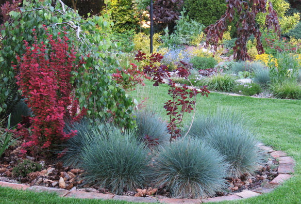 Kostrzewa sina 'Blauglut' - kępkowa trawa o niebieskich, wąskich listkach, które swą barwę zachowują przez cały rok, również zimą. Osiąga wysokość około 20 centymetrów, w czasie kwitnienia do 30, podobną również średnicę. Preferuje stanowiska słoneczne, podłoże przepuszczalne, z domieszką piaskowego. Kostrzewa sina jest jedną z najmniej wymagających traw ozdobnych, a zarazem jedną z najatrakcyjniejszych. Odporna na szkodniki, suszę oraz mróz, najbardziej wybarwia się na piaszczystych i ubogich glebach.