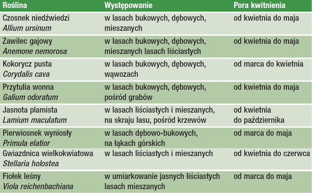 Czosnek niedźwiedzi nie od razu rzuca się w oczy, jest jednak duża szansa, że najpierw go poczujemy, bo cała roślina wydziela charakterystyczny czosnkowy zapach. Oryginalnym aromatem wyróżnia się też przytulia wonna, ale gatunek ten zaczyna pachnieć dopiero wtedy, gdy więdną liście. Kobiercami kwitnie jaskier wiosenny o drobnych żółtych kwiatach.