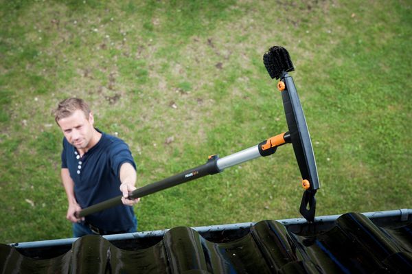 Trzeba oczyścić też rynny. Warto skorzystać z bardzo poręcznej szczotki do rynien Fiskars. Jej końcówki można ustawiać pod różnym kątem, dzięki czemu w szybki sposób oczyścimy wszystkie zakamarki. Dwa rodzaje zakończenia – szczotka i skrobak – oraz długi, teleskopowy trzonek narzędzia sprawi, że czyszczenie rynien stanie się dziecinnie proste.