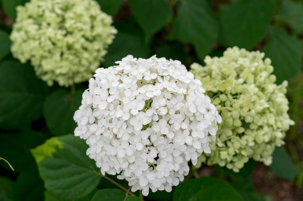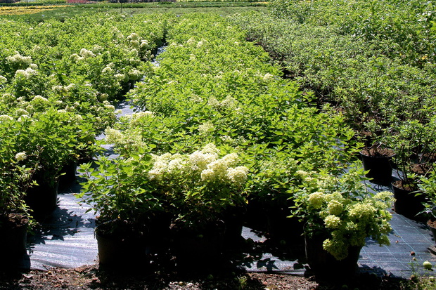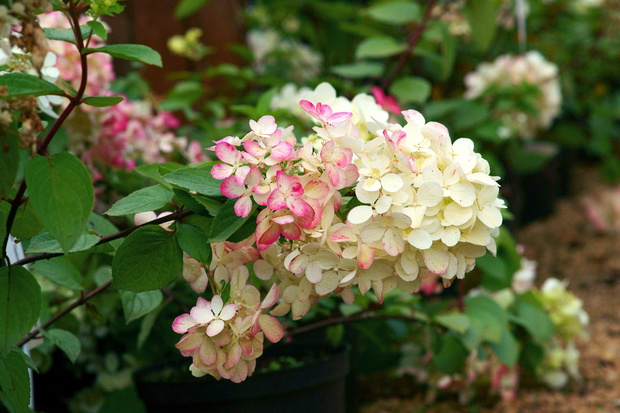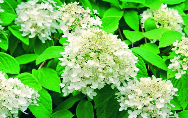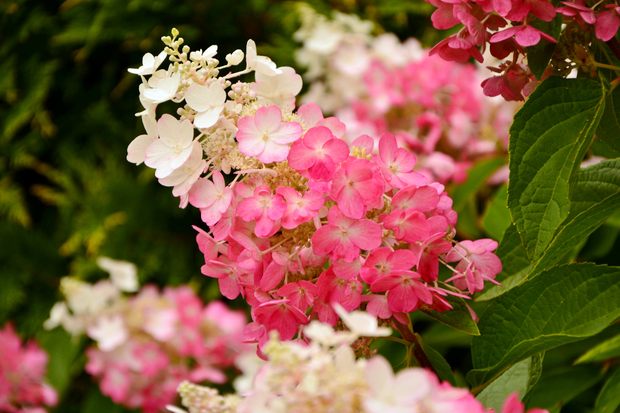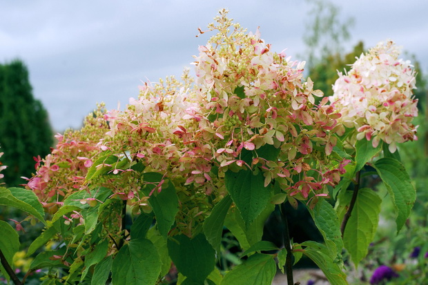 Pełnia kwitnienia atrakcyjnych krzewów hortensji bukietowej Hydrangea paniculata. Szczególnie efektowne są odmiany o dużych kwiatostanach zbudowanych z płonnych kwiatów, jak ‘Candlelight’, ’Limelight’, ’Magical Candle’, ’Magical Fire’, ’Magical Moonlight’, ’Mega Mindy’ ’Phantom’, ’Polar Bear’, ’Silver Dollar’, ’Rensum’, ’Renhy’. Odmiany te mają okazałe kwiatostany.