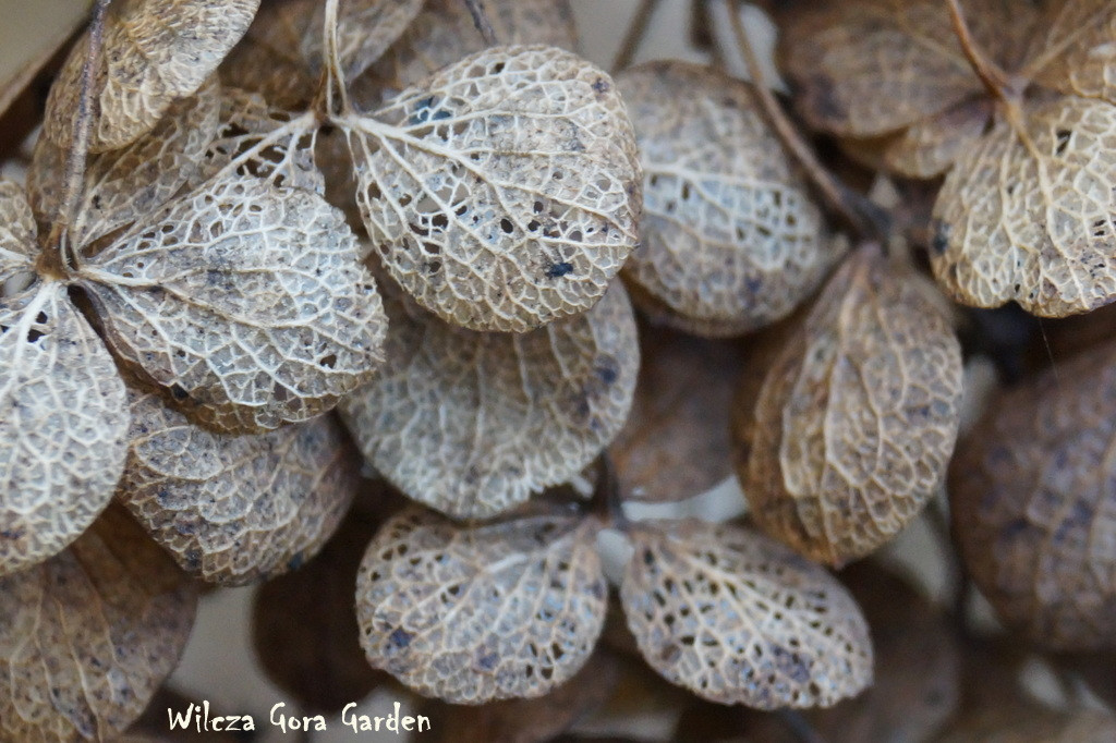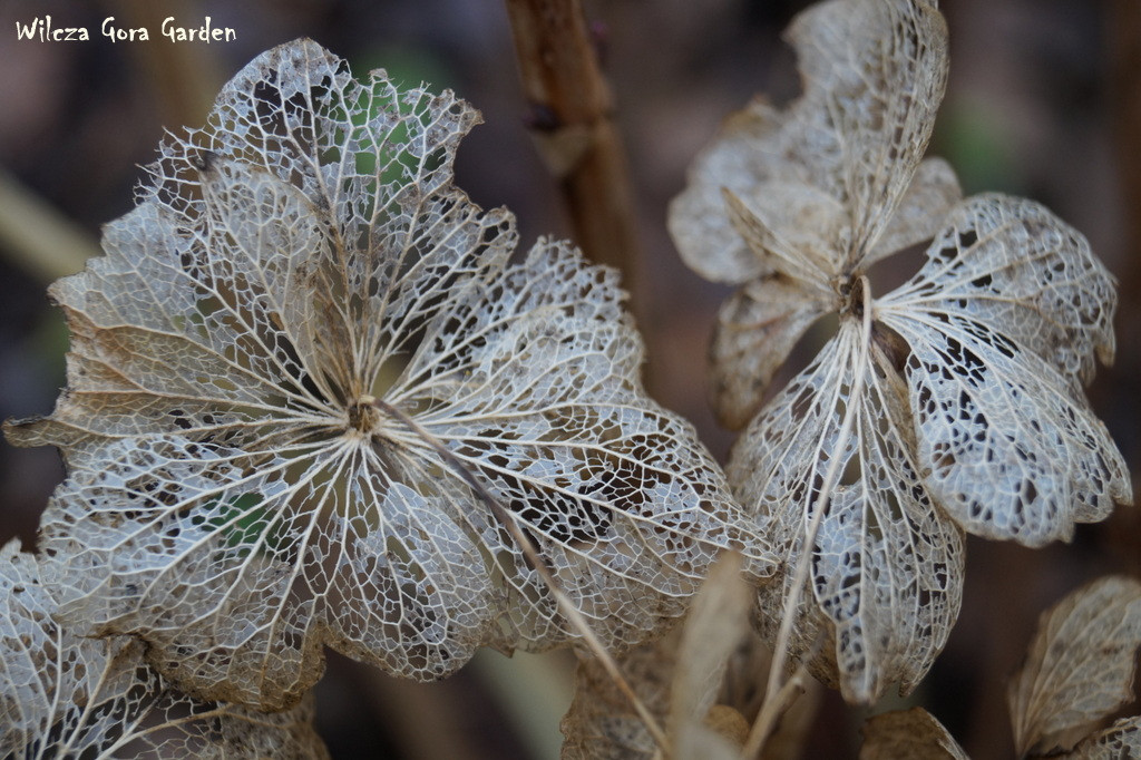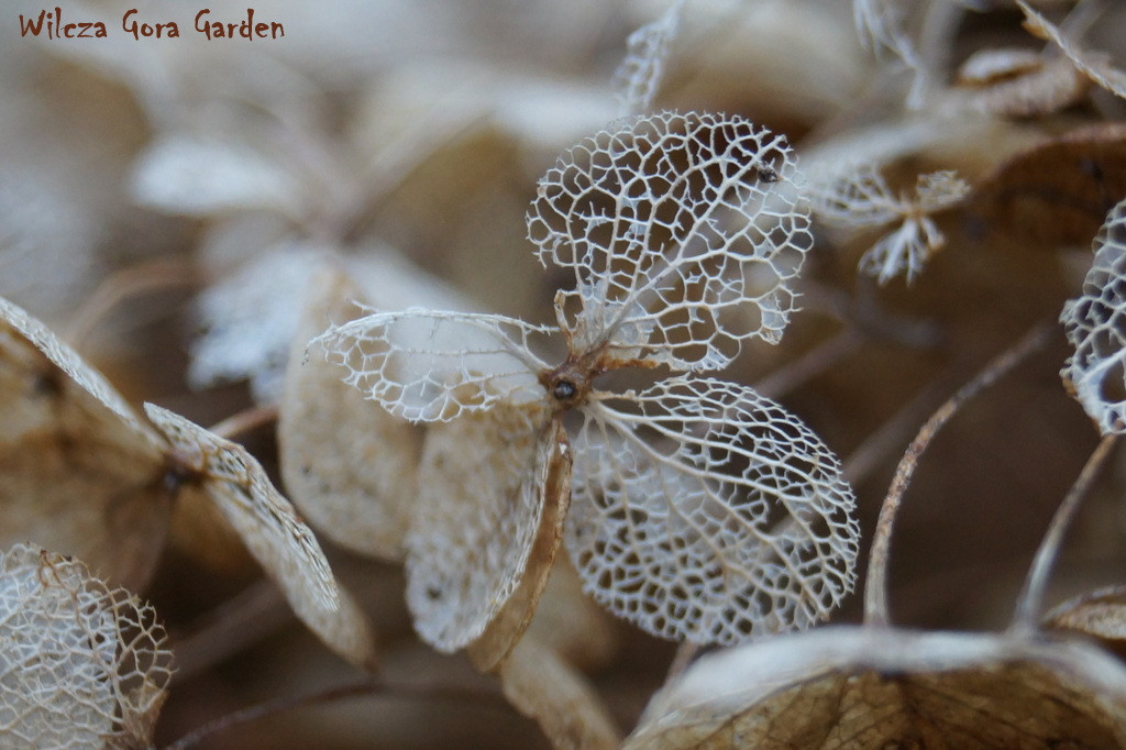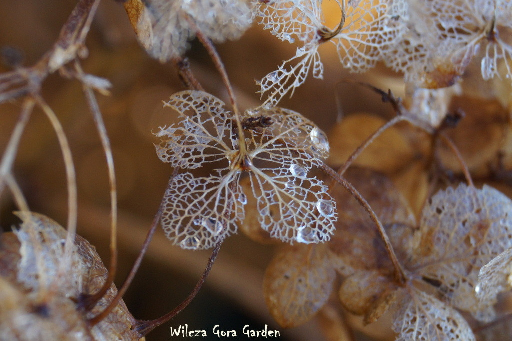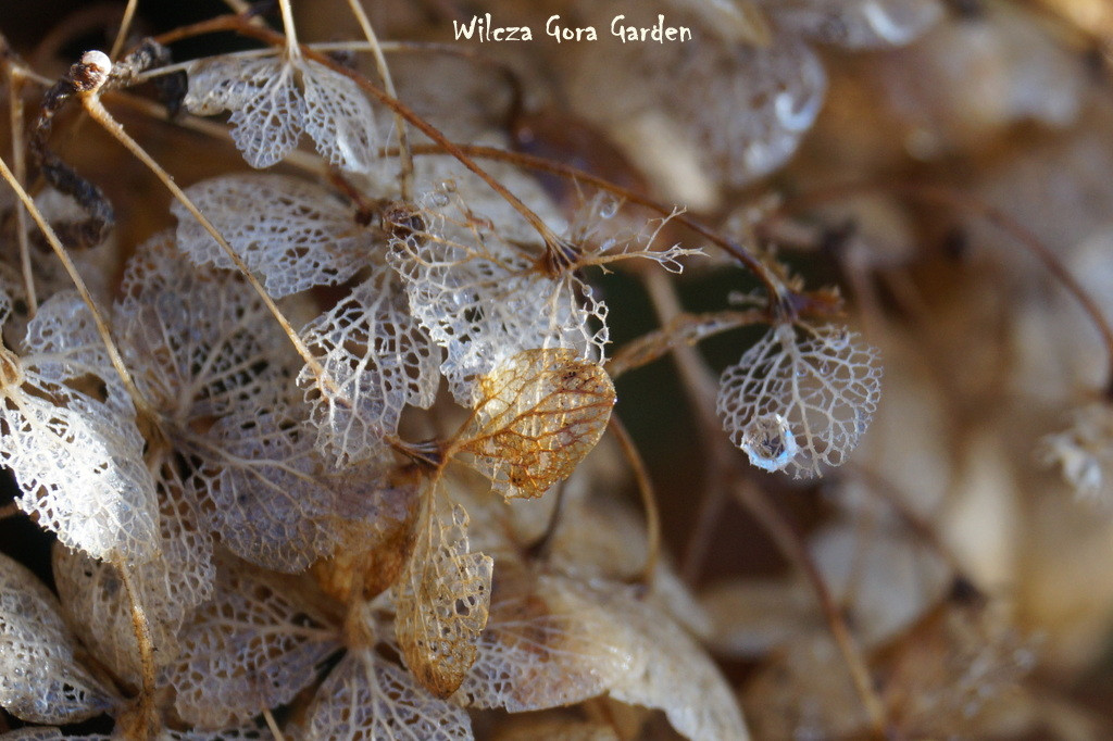 Ta galeria pokazuje, jak ciekawie z kwiatami hortensji bukietowych i ogrodowych obchodzi się mróz...wspaniałe, ażurowe koronki, w ciepłych beżach i jasnych brązach ładnie komponują się z jesiennym, bardzo stonowanym tłem naszego ogrodu...a kiedy deszcz zostawi swoje krople na koronkach, tworzy się przepiękny efekt...