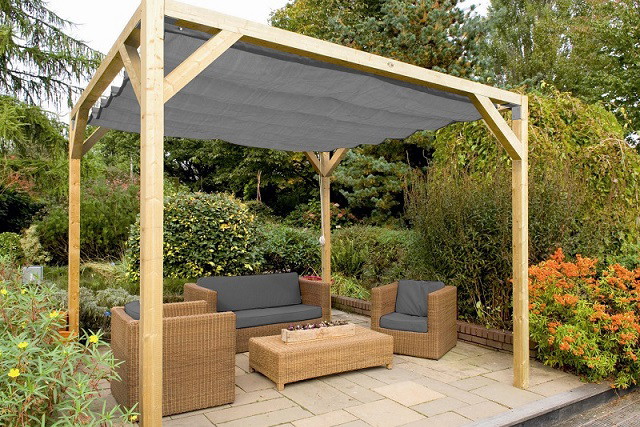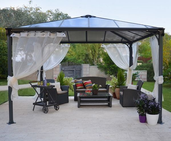 Poliwęglan to materiał o strukturze kanalikowej, który zapewnia doskonałą ochronę przed deszczem, promieniami słonecznymi (nie ograniczając przy tym dostępu światła). Jest on jednocześnie odporny na uszkodzenia mechaniczne spowodowane przez grad lub powiewy wiatru. Altany ogrodowe tego typu wyglądają niesamowicie estetycznie, zwłaszcza jeśli dołączymy do nich zwiewne moskitiery. Altana otwarta na zdjęciu, ze względu na swoja wagę, wymaga kotwienia w podłożu. Kupując produkt, warto wybrać tego producenta, który do zestawu dołącza elementy pomocne w kotwieniu całej konstrukcji w ziemi lub dzięki którym można przytwierdzić altanę do podłogi tarasowej.