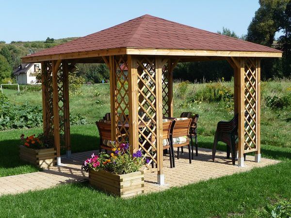 Altana otwarta Ewa. Konstrukcja i dach wykonane są z zaimpregnowanego drewna sosnowego. Na dachu ułożono poszycie z gontu. Wymiary: 3mx3m. |