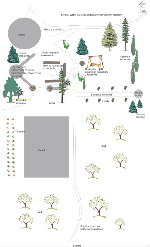 Większość naszej posesji dekorują iglaki, drzewka ozdobne i kwiaty, ale za domem znalazło się miejsce dla zagonu truskawek. Z drugiej strony budynek otacza sad. Planujemy również zbudować tutaj domową wędzarnię połączoną z suszarnią owoców i grzybów.