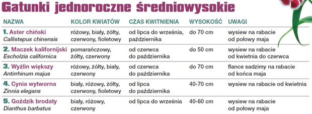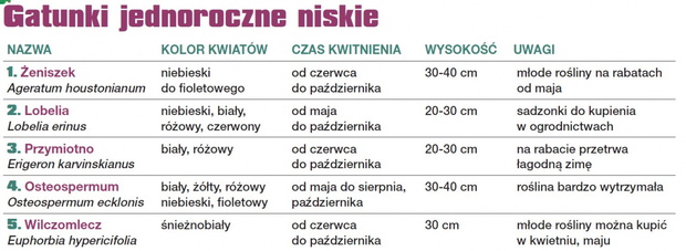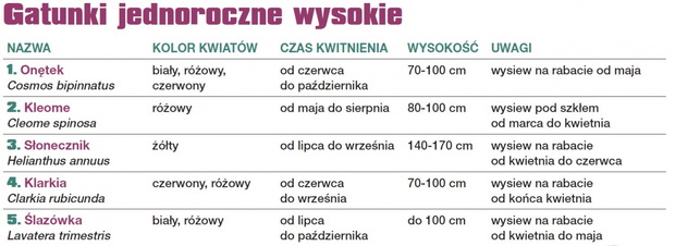 W tabelach przedstawiamy kilkanaście sprawdzonych gatunków kwiatów letnich. Można je łączyć w dowolny sposób. Wygląd letniej rabaty zależy tylko od indywidualnych upodobań. Już w kwietniu można wysiewać do gruntu niektóre gatunki, a w maju flancować młode rośliny.