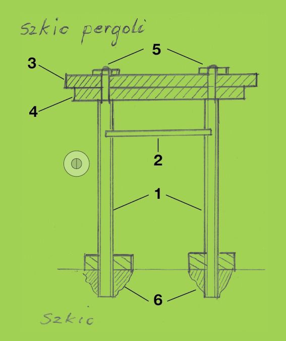 - Za ławką, w odległości ok. 40 cm, wykonujemy pergolę z dwóch rur o średnicy 5 cm długości 230 cm.
