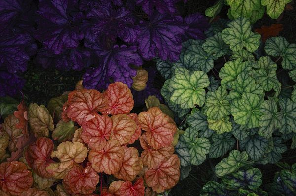 Żurawki o czerwonobrązowych liściach tworzą wspaniałe akcenty barwne na klasycznych rabatach. Jeśli w ubarwieniu ich liści występują odcienie fioletu, to można je zestawiać z purpurowymi lub różowymi kwiatami. żurawki o liściach żółtych i pomarańczowych czują się najlepiej w miejscach półcienistych (podobnie jak odmiany zielone). Gdy rosną w słońcu, na liściach powstają plamy.