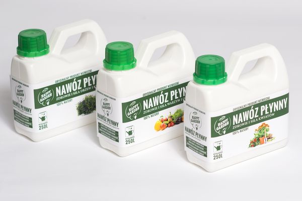 Zestaw naturalnych nawozów ogrodniczych firmy Happy Garden - happygarden.pl: W skład zestawu wchodzą trzy 250ml opakowania płynnych nawozów, przeznaczonych do odpowiednio - drzew i krzewów, owoców oraz kwiatów.