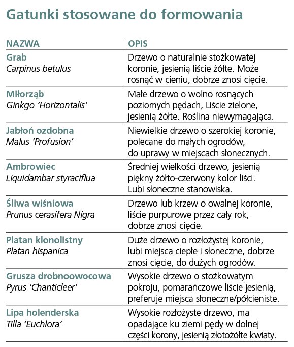 Drzewa o płaskich koronach to świetne rozwiązanie zwłaszcza w małych ogrodach. Rośliny utrzymywane w ryzach mogą z powodzeniem imitować elementy architektoniczne. Jedne drzewa nadają się do formowanie lepiej, inne gorzej, zależnie od walorów ozdobnych czy naturalnych cech rozwojowych. Tradycyjnie na szpalery i zadaszenia stosuje się buki, graby, lipy, klony, ambrowce.
