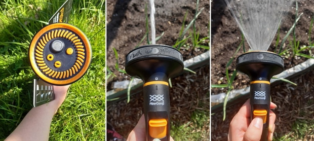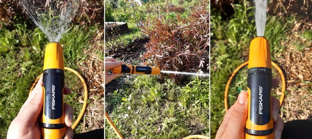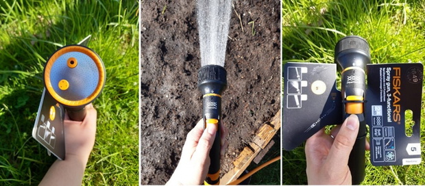 Innym pistoletem był FiberComp™ Pistolet zraszający, 3-funkcyjny. Jego główną zaletą jest ogromna uniwersalność i łatwość w obsłudze. W kontrolowany sposób można szybko przejść od skoncentrowanego strumienia po ten delikatniejszy, który nie uszkadza drobniejszych roślinek. Obrotowa wymienna głowica SoftGrip™ umożliwia wybór rodzaju strumienia: silnego punktowego, natryskowego lub delikatnej mżawki. Uchwyt z tworzywa FiberComp™ jest dwa razy bardziej wytrzymały i posiada regulację przepływu wody za pomocą kciuka. Część systemu modularnego Fiskars to możliwość dowolnego łączenia głowicy z uchwytem w zależności od indywidualnych potrzeb. Jest odporny na mróz oraz niezwykle przyjemny w dotyku w porównaniu z metalowymi innych firm.