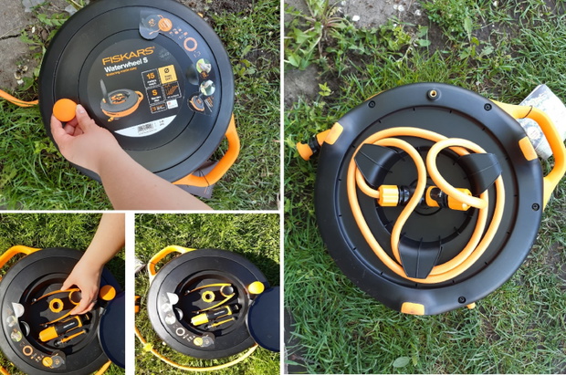 Dodatkowo w zestawie znajduje się wąż przyłączeniowy o długości 1,5 m i średnicy 9 mm (3/8”) z szybkozłączem. Ciekawą niespodzianką było to, co pod spodem! Tam kryło się jeszcze więcej udogodnień! Zintegrowany schowek do przechowywania akcesoriów zawiera: dyszę zraszającą, uniwersalne przyłącze kranowe, szpilkę do mocowania bębna do trawnika oraz podpórkę, dzięki której można używać dyszy w charakterze zraszacza. Dobrym rozwiązaniem jest uniwersalne przyłącze pasujące do kranów o trzech najbardziej popularnych średnicach.