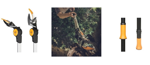 A jak poradzić sobie z gałęziami, które znajdują się naprawdę wysoko? Oczywiście zawsze można skorzystać z drabiny i maszerować z nią od drzewa do drzewa. Można też usprawnić pracę i skorzystać z regulowanej długości trzonka sekatora. Model UPX86 z teleskopowym trzonkiem, posiada bezstopniowo regulowaną długość w zakresie od 2,4 do 4 m, a to pozwala na pracę o zasięgu do ok. 6 m. Natomiast sekator UPX82 umożliwi pracę na wysokości do ok. 4,5 m. Wybierając te rozwiązania drabinę możemy zostawić w garażu.