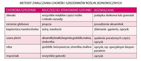 Rośliny jednoroczne, tak jak pozostałe na naszych działkach, padają czasem ofiarą chorób i szkodników. Jakie zadania stoją przed ogrodnikiem? Przede wszystkim należy właściwie rozpoznać problem, a następnie zastosować odpowiednie rozwiązanie.