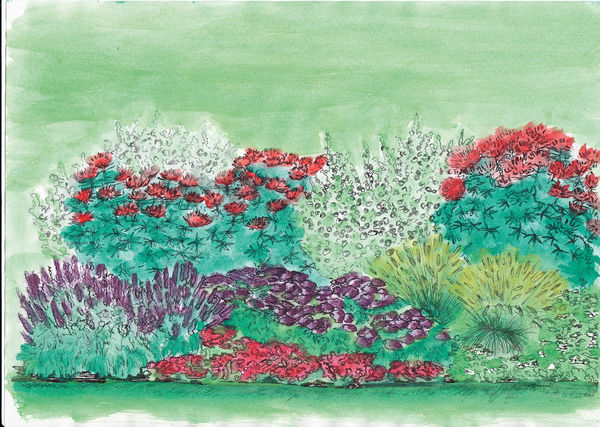 Czytelnikom „Przepisu na Ogród” proponuję kilka, moim zdaniem, najładniejszych i stosunkowo łatwych w uprawie kwiatów jednorocznych, które dobrze rosną na wschodniej stronie ogrodu. Są to: ślazówka letnia, kleoma kolczasta, heliotrop, szałwia omączona, goździk chiński, rozplenica japońska. Załączam też jeden ze swoich rysunków takiej rabaty (rys. 1)