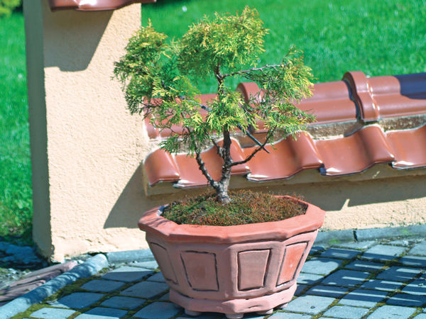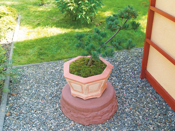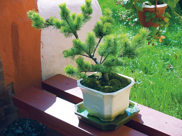 Klasyczna doniczka świetnie pasuje do sosny drobnokwiatowej 'Shikoken'. |