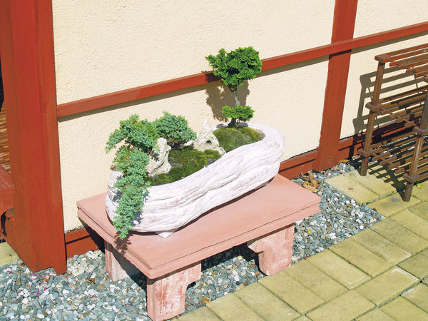 Zaaranżowane w pojemnikach rośliny (jałowiec płożący 'Glauca' i cyprysik tępołuskowy) można tak ukształtować, aby stworzyły miniogród. |