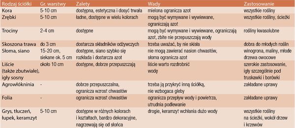 Ściółka ma także ładnie wyglądać, więc warto przemyśleć, jakie kolory i faktura będą pasowały do stylu naszego ogrodu. Najpopularniejsze rodzaje ściółek, ich wady, zalety i zastosowanie przedstawia tabela powyżej. Do ściółkowania można używać także wielu innych materiałów. Wybór zależy od fantazji ogrodnika.