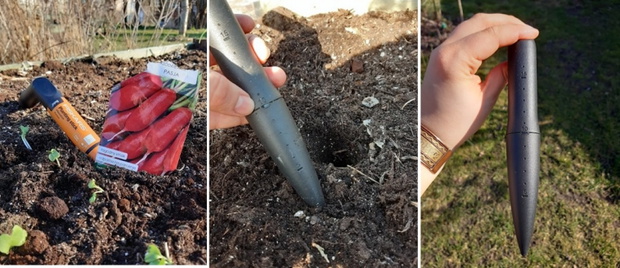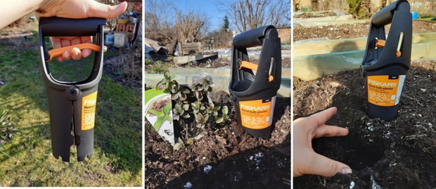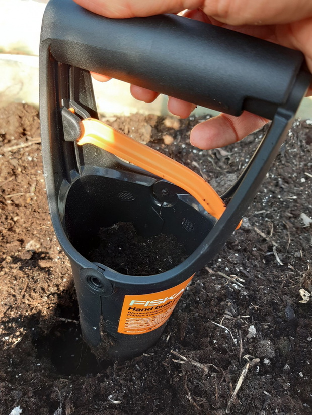 Sadzarka Solid marki Fiskars doskonale sprawdziła się przy nasadzeniach cebul, ale także drobnych ziół, takich jak mięta czekoladowa. Jest idealna do szybkiego i dokładnego sadzenia cebul i sadzonek. Stożkowy koniec roboczy jest wyposażony w "zęby" do szybkiego i wydajnego kopania otworu w ziemi ruchem okrężnym. Pozwala to na precyzyjny wybór miejsca otworu oraz umiejscowienie rośliny. Sadzarka posiada z boku oznaczoną skalę do dokładnych odczytów głębokości. Po naciśnięciu pomarańczowej dźwigni w uchwycie siewnik lekko się uchyli, a ziemia zostanie z niego uwolniona w celu przysypania cebuli ziemią. To sprawdzony przez nas sposób, który zapewnił na szybsze i łatwiejsze nasadzenia w kilku miejscach. Jest wytrzymała i niezwykle lekka. Poręczna, a do tego świetnie pomyślana konstrukcja ułatwia większą ilość nasadzeń.