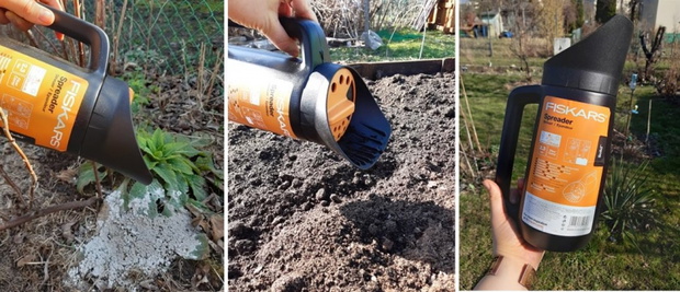 Podczas wiosennych prac ogrodowych przygotowywaliśmy miejsca pod nawożenie roślin z użyciem Siewnika marki Fiskars. Doskonale poradził sobie w przypadku nawożenia wapnem, ochraniającym krzewy czarnej porzeczki czy innych krzewów owocowych. Równomierne rozprowadzenie pozwoliło na szybszą pracę. W zależności od grubości nawozu oraz jego ilości, można z łatwością regulować jego dystrybucję. Za pomocą pokrętła zmieniamy wielkość otworów, aby dopasować "grubość oczek".