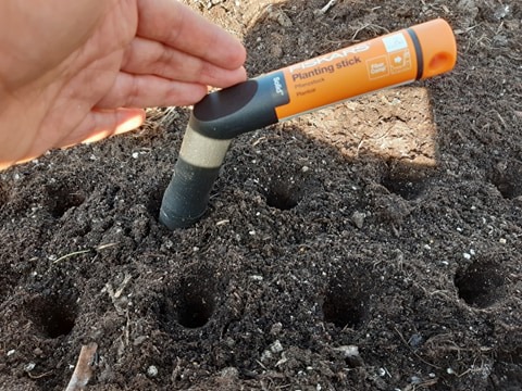 Podczas prac przy wysiewie nasion i pikowaniu używaliśmy Pikownik Solid marki Fiskars, który służy do tworzenia otworów w ziemi, wysiewania nasion, sadzenia cebulek i delikatnych roślin na odpowiedniej głębokości. Na narzędziu znajduje się dodatkowo podziałka do 150 mm. Jej wygodnie uformowany uchwyt w kształcie liter „L” zapewnia duży komfort podczas prac ogrodowych. Sprawia, że ręka nie musi wyginać się oraz nadgarstek jest znacznie odciążony. Wykonany został z wytrzymałego tworzywa FiberComp odpornego na warunki atmosferyczne.