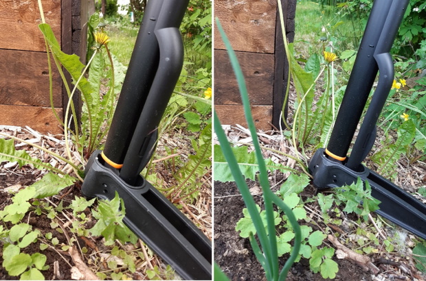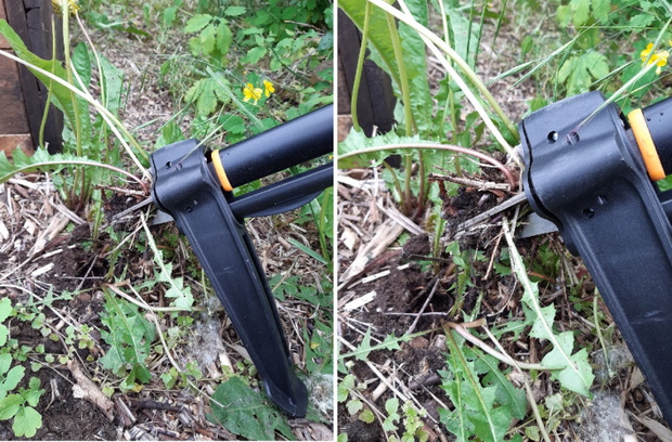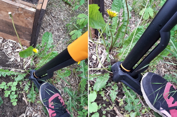 2. Nastąp na podpórkę stopą. Wyjmij narzędzie z ziemi razem z chwastem.
