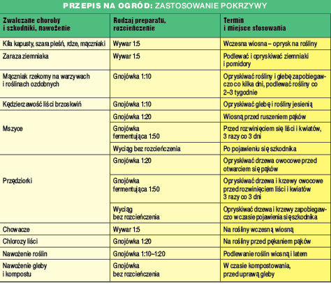 Wywar z pokrzywy w rozcieńczeniu 1:5 stosuję wczesną wiosną do zwalczania na krzewach owocowych następujących chorób grzybowych: zamieranie pędów malin, szara pleśń, amerykański mączniak agrestu, rdza. Wywar przygotowuję, zalewając kilogram ziela lub 200 g suszu 10 litrami wody. Gotuję to przez 30 minut. Preparatem o tym samym rozcieńczeniu opryskuję też rozsadę kapusty przeciwko chowaczom łodygowym oraz kile kapusty.