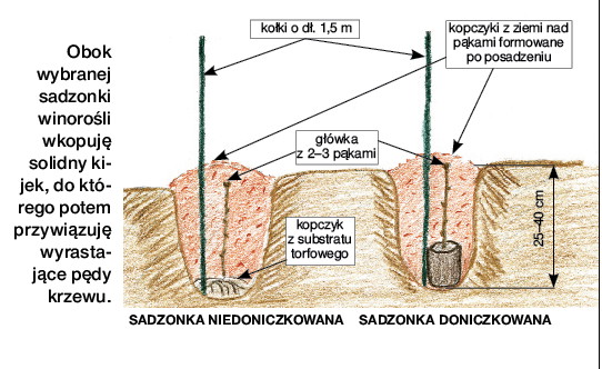 - Na dnie dołka formujemy mały kopczyk z lepszej ziemi (np. z substratu torfowego), na którym rozkładamy dokładnie korzenie. Taką sadzonkę przysypujemy do połowy jej długości ziemią, wlewamy około 5 litrów wody i dosypujemy ziemi. Nad powierzchnię gruntu powinna wystawać tylko główka z pąkami, którą następnie kopczykujemy. Razem z sadzonkami zakopujemy odpowiednio grube podpory. W mojej uprawie zastosowałem leszczynowe kijki. Do nich przez pierwsze dwa lata będziemy przywiązywać rosnące winorośle. Właściwe rusztowanie budujemy w drugim roku jesienią lub w trzecim wiosną.