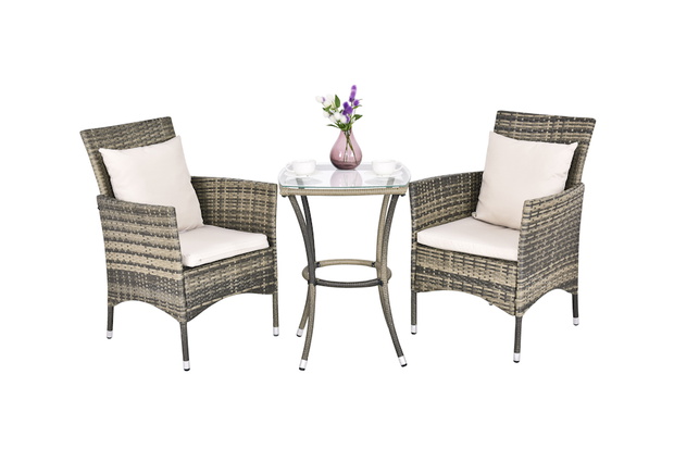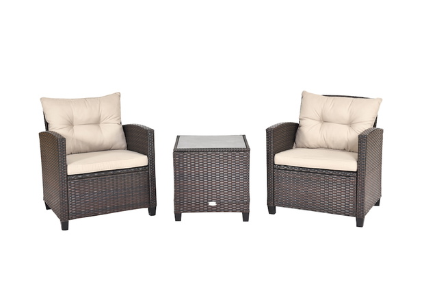 Meble ogrodowe rattanowe – stolik i dwa krzesła, Costway. Trzyczęściowy zestaw mebli ogrodowych. W jego skład wchodzą: stolik ze szklanym blatem i dwa krzesła z poduszkami. Meble zostały wykonane z najwyższej jakości polirattanu oraz stalowej ramy. Materiały oraz wykonanie zapewniają trwałość oraz odporność na warunki atmosferyczne.