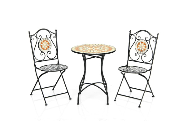 Okrągły stół ogrodowy i krzesła z mozaiką, Costway. Mozaika przypomina klimat śródziemnomorskich miasteczek, a klasyczna forma wykonania nawiązuje stylem do paryskich kafejek. Krzesła są poręczne i lekkie, a jednocześnie solidne i wytrzymałe. Zestaw jest łatwy w montażu jak i czyszczeniu.