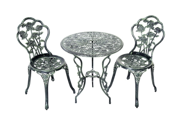 Zestaw mebli ogrodowych odlewnych żeliwno-aluminiowych, Costway. Zestaw odlewanych mebli ogrodowych wykonano z najnowocześniejszego aluminium, dzięki czemu są trwałe i solidne, a jednocześnie lekkie. Cały zestaw składający się z dwóch krzeseł i stołu waży 12 kilogramów. Zastosowane materiały zapewniają odporność na rdzę i trwałość.