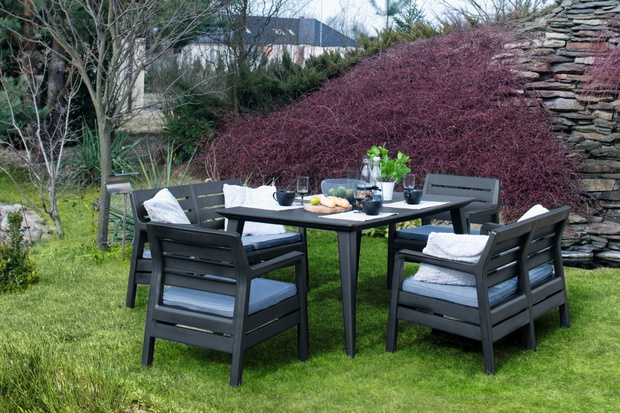 Meble ogrodowe DELANO SET znakomicie wkomponują się w otoczenie domu w nowoczesnym stylu. Uwaga: wygodne poduszki na siedziskach sprawiają, że poranna kawa przeciąga się do południa. / (zdj.: Keter)