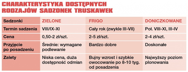 Sadzonki te możemy wysadzać do ogrodu w dowolnym czasie, nawet w pierwszej połowie lata, kiedy sadzonek zielonych jeszcze nie ma.Trzecią możliwością założenia nowej plantacji jest wykorzystanie sadzonek doniczkowanych. Wiele szkółek oferuje właśnie sadzonki w małych doniczkach lub w multiplatach. Są to sadzonki ukorzenione w podłożu, które wysadzamy na miejsce stałe razem z całą bryłą korzeniową, co gwarantuje niemalże 100% przyjęcie się materiału. Sadzonki te zwykle dostępne są od sierpnia do końca jesieni.