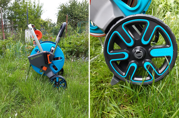 Wózek na wąż AquaRoll M Easy w zestawie wraz z wężem ogrodowym gwarantuje idealną stabilność. Nawet na nierównym podłożu, stawiając go na niezbyt dokładnie wykoszonej trawie, dzięki kształtowi podpórki nie musiałam się przejmować, że będzie stał niepewnie. Wózek nie porusza się, nawet podczas wyciągania węża, co dla mnie jest ogromnym plusem. To wszystko dzięki technologii Kick&Stand.