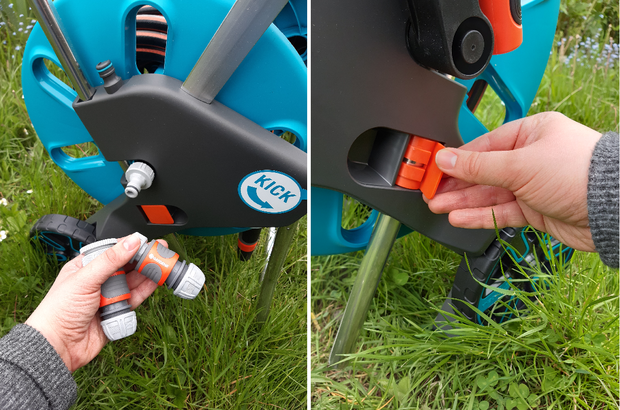 Skośne podłączenie węża od wewnątrz rolki zapobiegał zginaniu się węża - to ogromny plus, ze względu na maksymalny przepływ wody. Specjalny system chroniący przed wyciekaniem wody po zakończeniu pracy i nawijaniu węża na wózek sprawdził się perfekcyjnie - nie zostałam oblana wodą, tak jak to bywało w przypadku innych wózków.