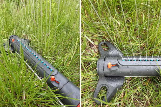 Dużym zaskoczeniem była możliwość podlewania części terenu - z lewej lub z prawej strony. Szerokość zraszania sprawia, ze mogłam dopasować się idealnie do granic działki, nie musząc przepraszać sąsiada za wkroczenie strumieniem wody na jego działkę ;) ( myślę, że tutaj nie miałby nic przeciwko). Szerokość zraszania wynosi od 3 do 14 metrów.