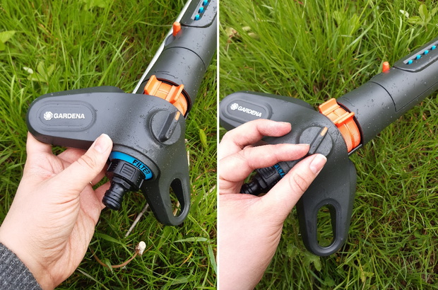 Przyłącze wodne AquaZoom M ma nierdzewny filtr metalowy, zapobiegający przedostawaniu się cząsteczek zanieczyszczeń do wnętrza zraszacza wahadłowego. Filtr można wyjąć i łatwo oczyścić pod bieżącą wodą. Dysze wykonano z miękkiego tworzywa, dlatego aby je oczyścić, wystarczy przetrzeć je palcami. To spora wygoda i usprawnienie.