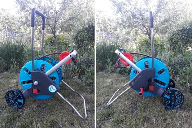 Podczas prac i podlewania w ogrodzie sprawdziła się wygodna prowadnica węża, która znajduje się na solidnej metalowej ramie nad bębnem. Zapewniła ona równomierne zwijanie węża - nie musiałam przytrzymywać dodatkowo ręką! Wystarczyło jedynie kręcić korbą przy bębnie.