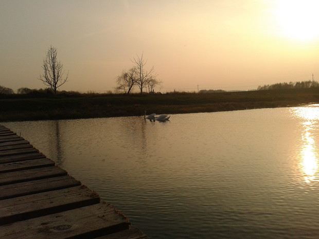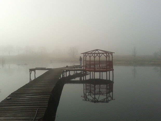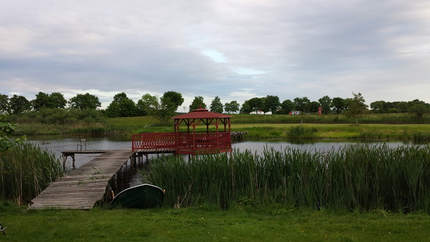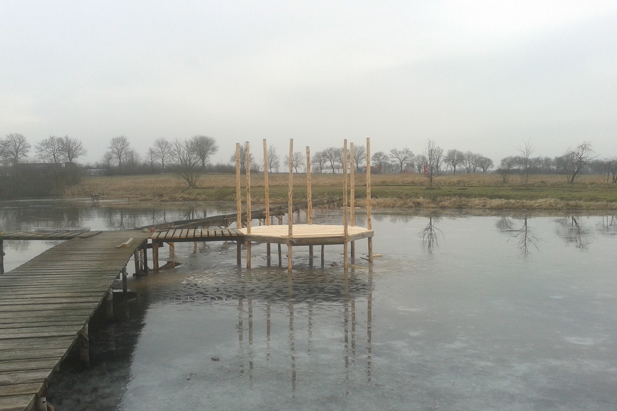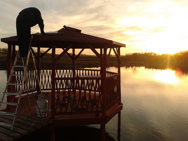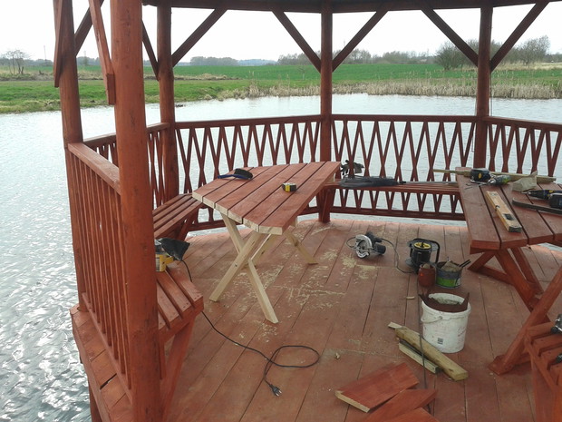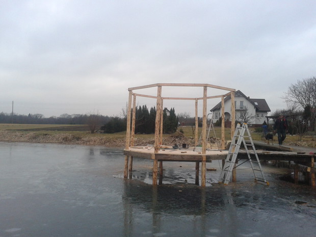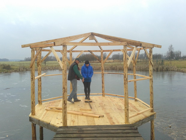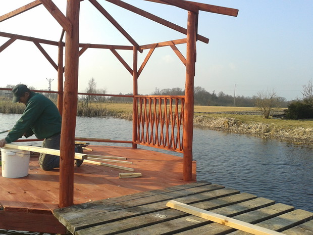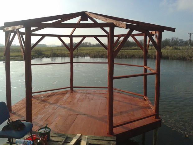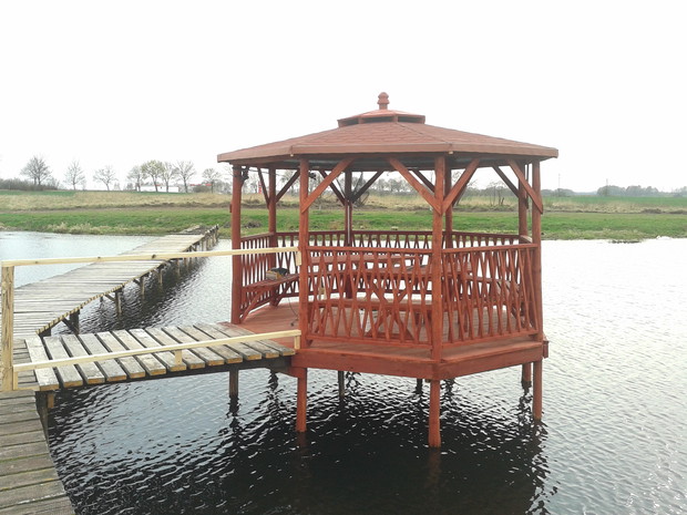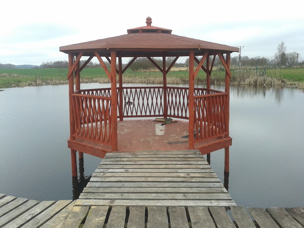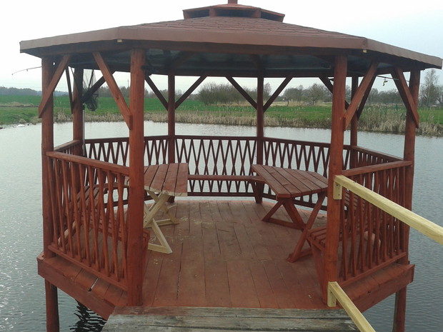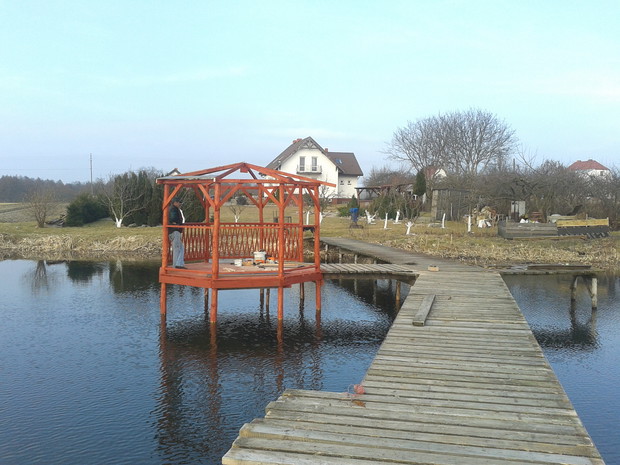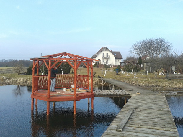 Altana została wybudowana własnoręcznie z projektu znalezionego w gazecie. Oryginalny projekt przewidywał budowę na plastykowych beczkach, natomiast niestabilność oraz wielkość altany zmusiła nas do zastosowania drewnianych pali wbitych w dno stawu. Dach wykonany jest z płyt oraz przykryty jest papą wierzchniego krycia. W środku zmieści się spokojnie 12 osób.