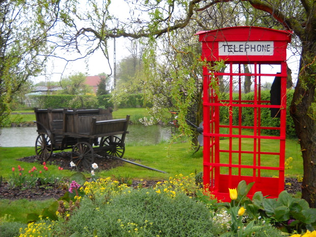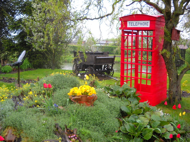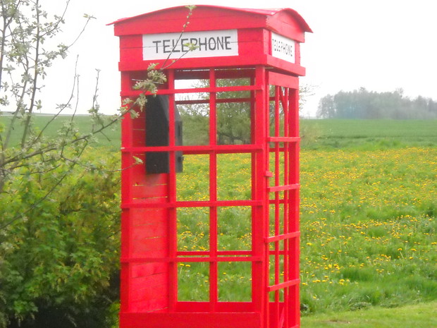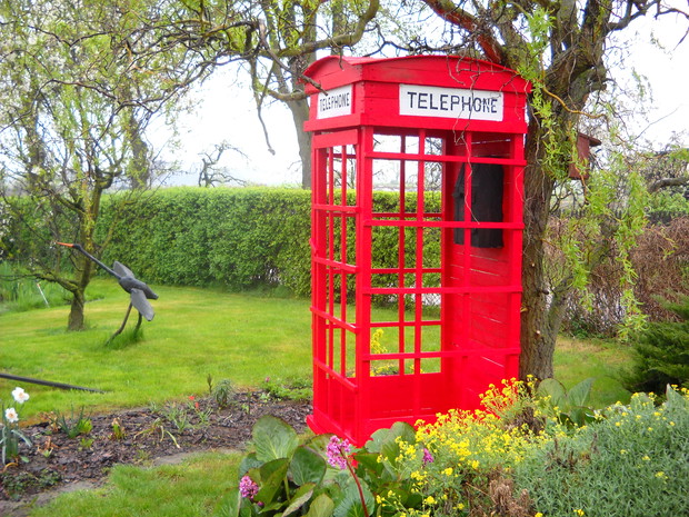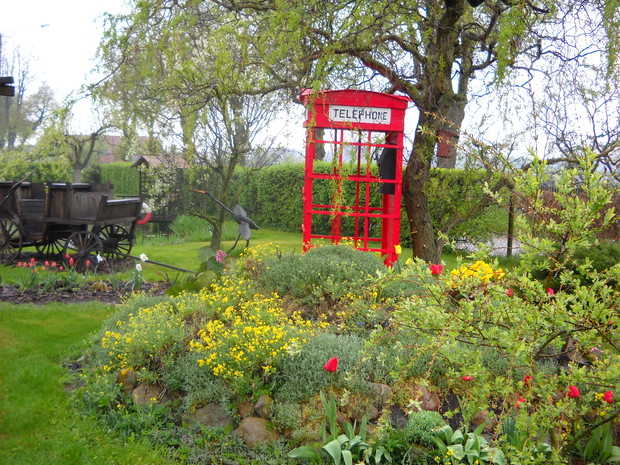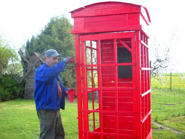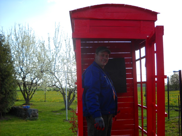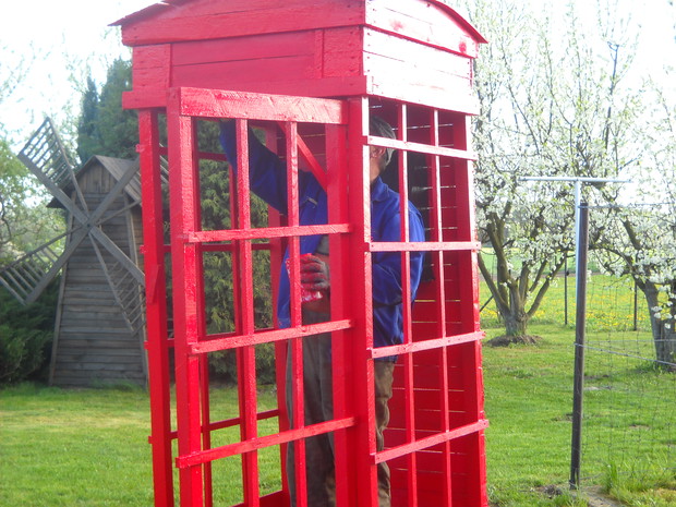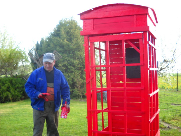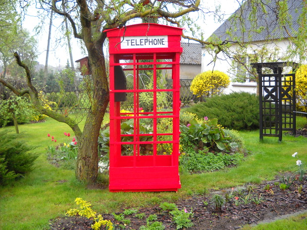 Budka telefoniczna pod styl Angielski znalazła miejsce w naszym ogrodzie w części dekoracyjnej.Od zawsze była marzeniem żony i tak się stało.Została zrobiona z drewna,desek i wkrętów.Jest w naturalnych rozmiarach 2.50cm.wysokości i 1.10cm.szerokości.Pomalowana została drewnochronem.Aby otrzymać taki efektowny kolor czerwieni,drewnochron został zmieszany z pigmętem.Budka jest bardzo ładną dekoracją,budzi zainteresowanie wśród przechodni.Na dzień dzisiejszy stoi pod wierzbą tuż obok rabaty i klombu.