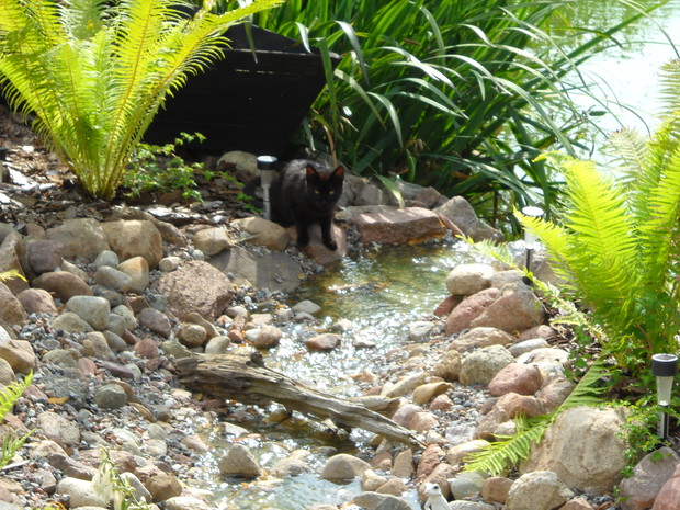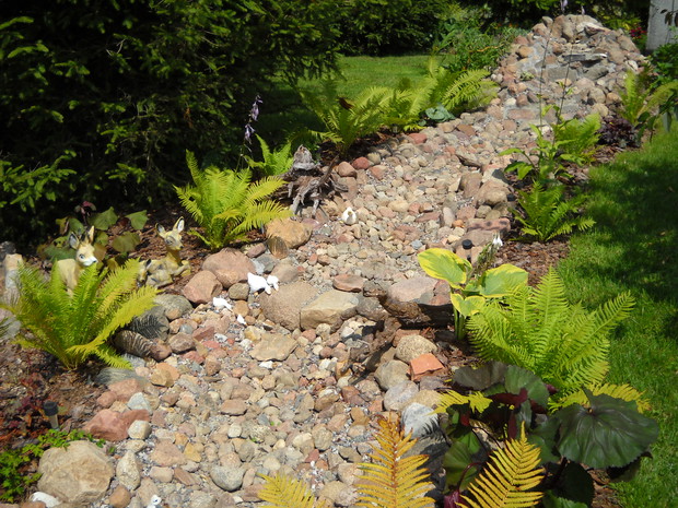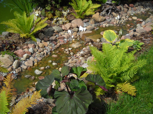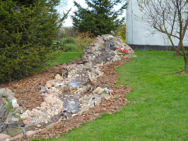 Rzeczka moje marzenie! W tym roku było można zauważyć pierwsze efekty.Z czasem nabierze uroku i naturalności pod wpływem roślin.Z przyjemnością można posiedzieć i odpocząć przy kąciku wypoczynkowym i zrelaksować się po ciężkim dniu.Miło jest posłuchać szumu wody który wydaje woda płynąca rzeczką.Planuje uzupełnić brzegi rzeczki roślinami typu traw ozdobnych różnych gatunków paproci i funki.Napewno nie zabraknie miniaturowych słoneczników które są u nas uwielbiane.