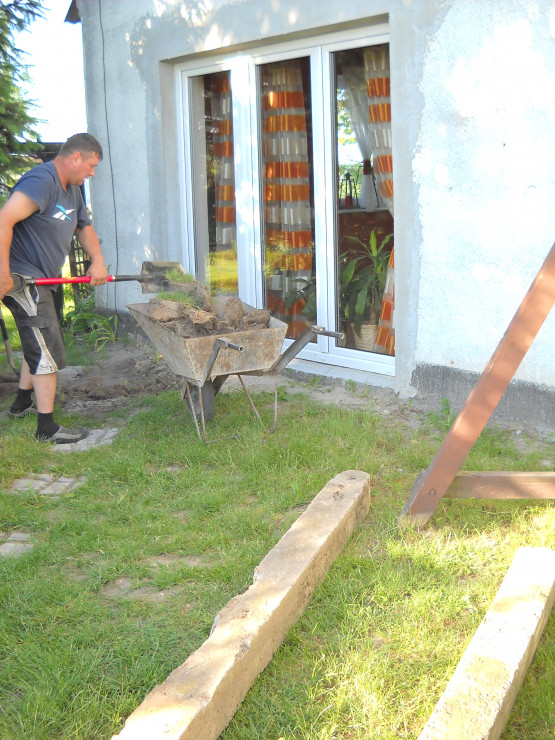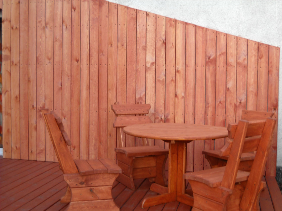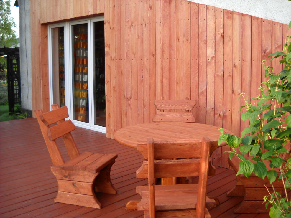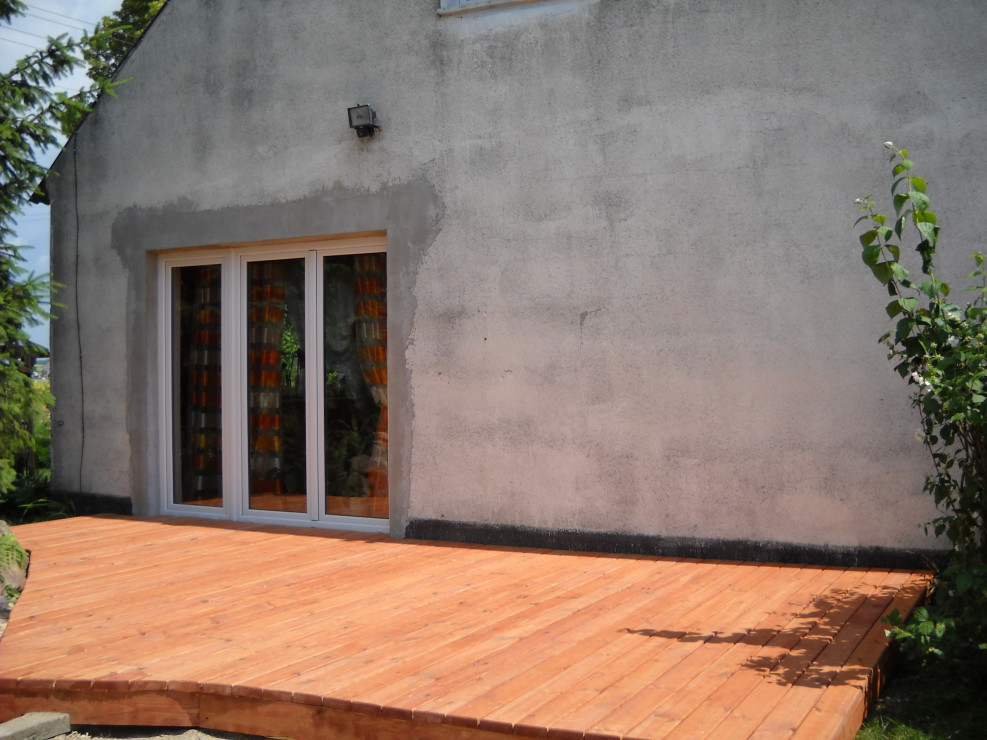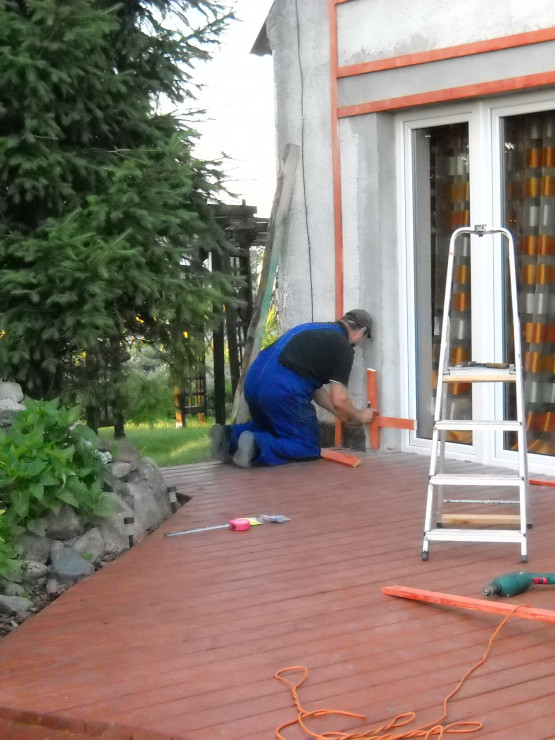 Od zawsze naszym marzeniem było duże okno tarasowe.Nie ma nic piękniejszego jak połączyć dom z ogrodem.Taras został zrobiony z drewna.Do wykonania były potrzebne deski ,wkręty oraz kołki szybkiego montażu.U nas zastosowane były deski o grubości 40mm na podłodze,natomiast na ścianie o grubości 18mm.Po przygotowaniu przez męża podłoża i zaimpregnowaniu belek i desek nastąpił czas na wykonanie.Z pozostałego drewna po tarasie mąż zrobił krzesła i stół które mają swe miejsce na tarasie.