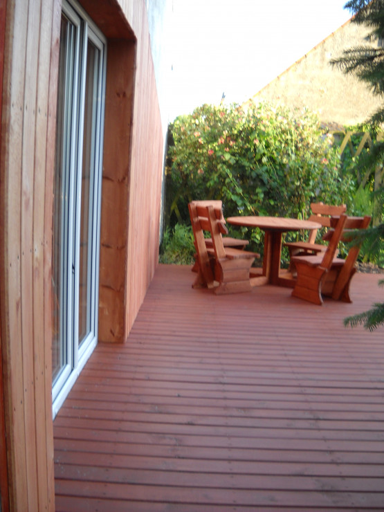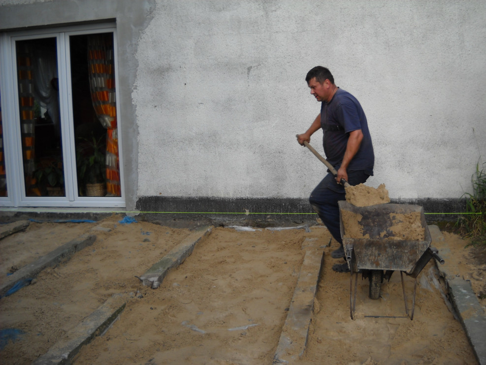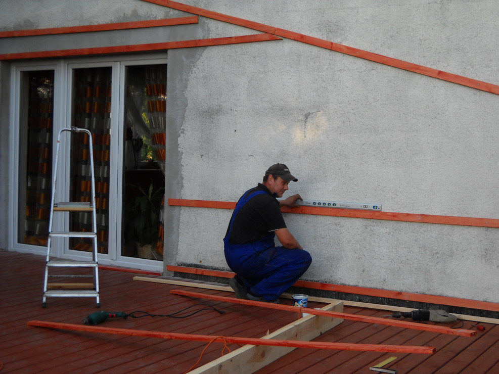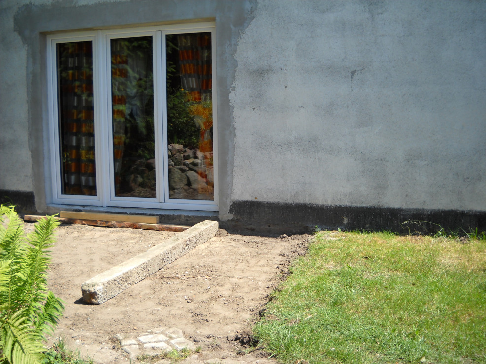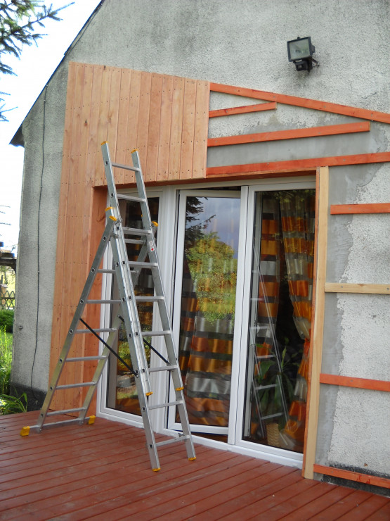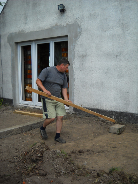 Od zawsze naszym marzeniem było duże okno tarasowe.Nie ma nic piękniejszego jak połączyć dom z ogrodem.Taras został zrobiony z drewna.Do wykonania były potrzebne deski ,wkręty oraz kołki szybkiego montażu.U nas zastosowane były deski o grubości 40mm na podłodze,natomiast na ścianie o grubości 18mm.Po przygotowaniu przez męża podłoża i zaimpregnowaniu belek i desek nastąpił czas na wykonanie.Z pozostałego drewna po tarasie mąż zrobił krzesła i stół które mają swe miejsce na tarasie.