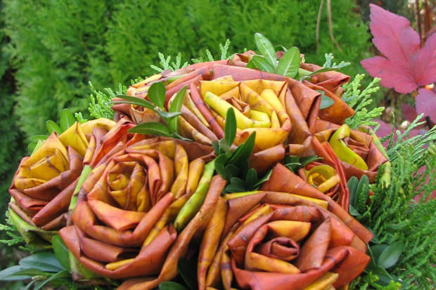 Gdy jesienią w ogrodzie jest już mało kwiatów robię bukiety z opadających liści.Takie liście bardzo łatwo można formować i układać w kształt różyczek.To dużo przyjemniejsze niż grabienie :) Jeśli do bukietu dodamy zimozielone gałązki w całości nam się zasuszy i będzie zdobił nasz dom nie tylko jesienią ale i zimą.Do tego bukietu wykorzystałam liście tulipanowca.Taki bukiet można pomalować na dowolny kolor farbą w sprayu ale ja zdecydowanie wolę naturalne barwy jesieni.