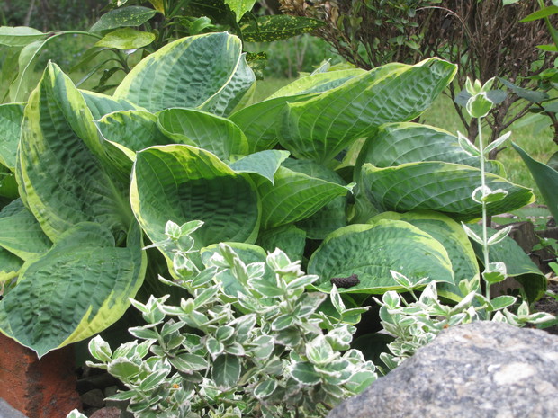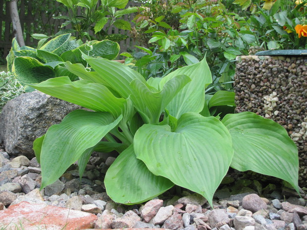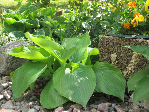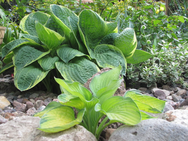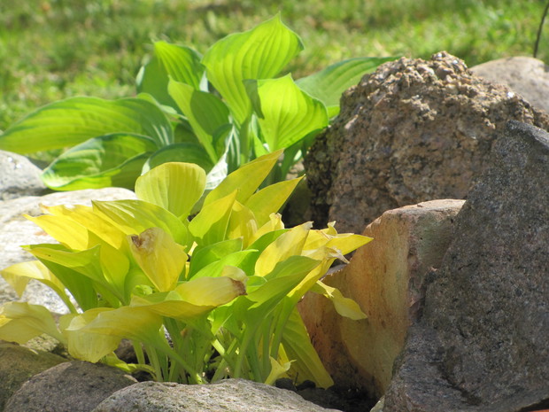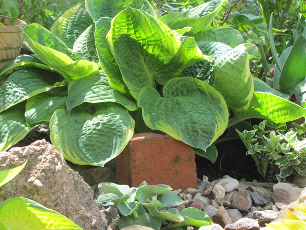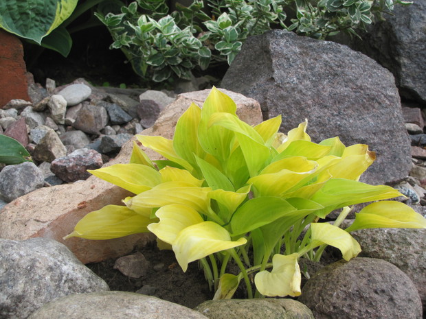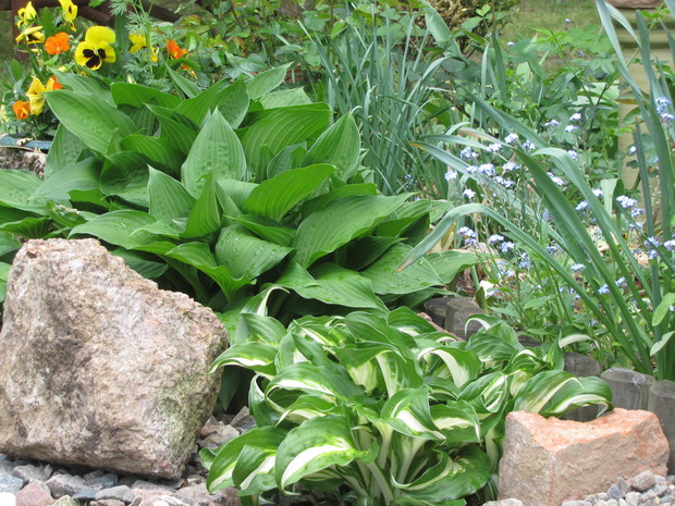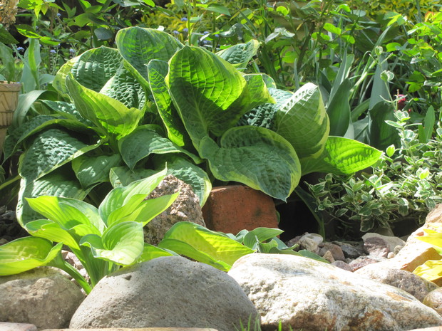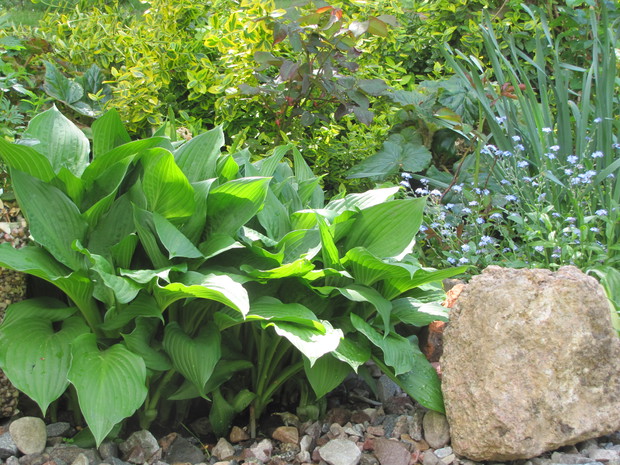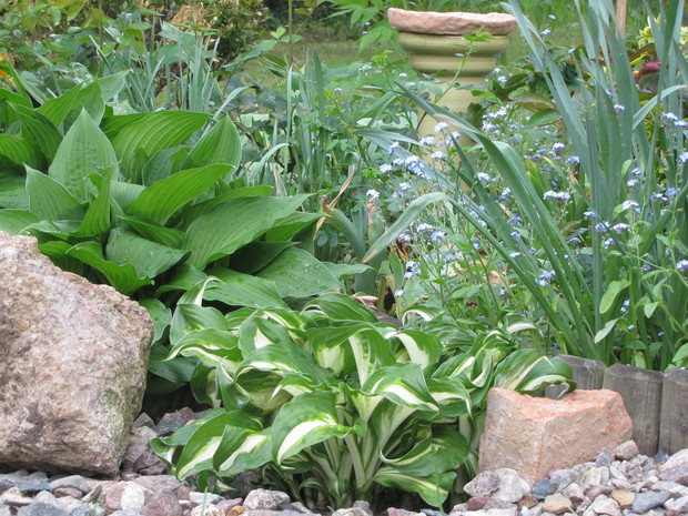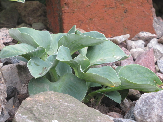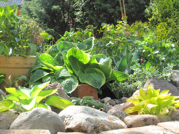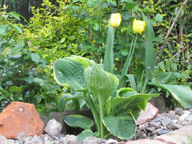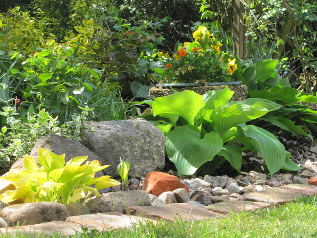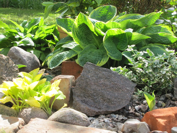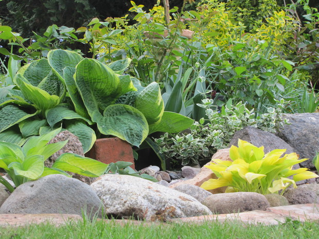 Jedna z moich rabat po zmianie ( po wiosennych cebulowych), zakątek kilka lat temu w słońcu, teraz za sprawą rozrośniętych iglaków latem stał się cienisty, rozproszone słońce zagląda tu wczesnym rankiem i wieczorem. Postawiłam na hosty, trzmieliny, parzydło, do całości dodałam otoczaków i łupanych kamieni kamieni, z czerwonej cegły zrobiłam obrzeża.