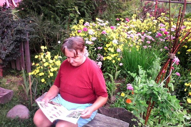 Oja mama czyta gazete"Moj piekny ogrod"w naszym zakatku w ogrodzie,bardzo zaciekawiona tematami w tym czerwcowym wydaniu,mysli nad zakupem czeresni............................................................................................................................................................