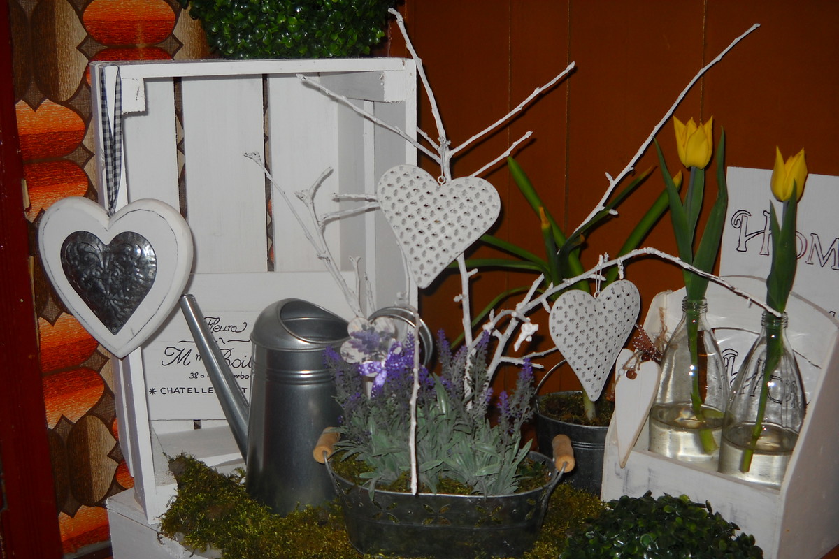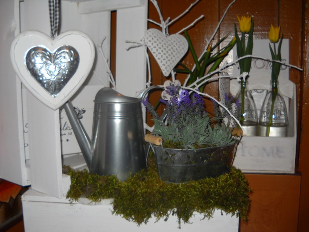 Lubię tworzyć dekoracje nie tylko w ogrodzie ale również w domu.Wykonuje je tanim sposobem.Skrzynki które są na zdjęciach zostały zbite z desek i pomalowane dziś sa miejscem na moje ozdoby które zmieniam od czasu do czasu.Gałązki od jabłonki pomalowałam farbą i świetnie się prezentują w kolorze białym.Dwie małe szufladki odmalowałam i ustawiłam świece i kwiatka.Niebawem wstawię następne dekoracje które wykonam sama.